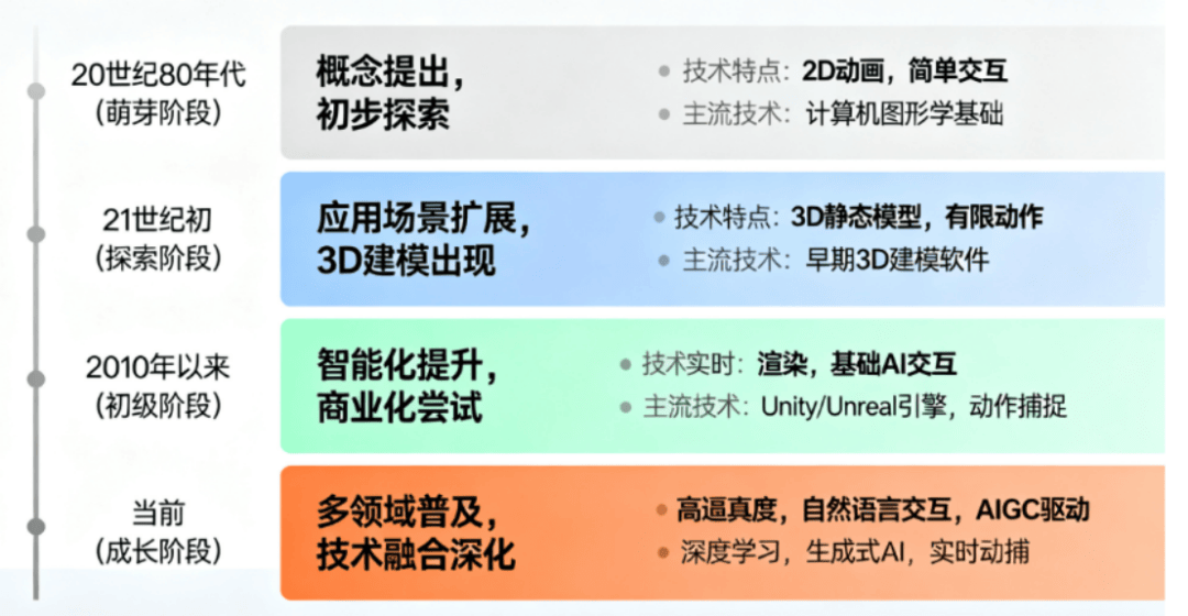 手艺摸索取初步使用阶段(2000年-2010年):跟着计较机图形学、动做捕获、语音识别等手艺的前进,